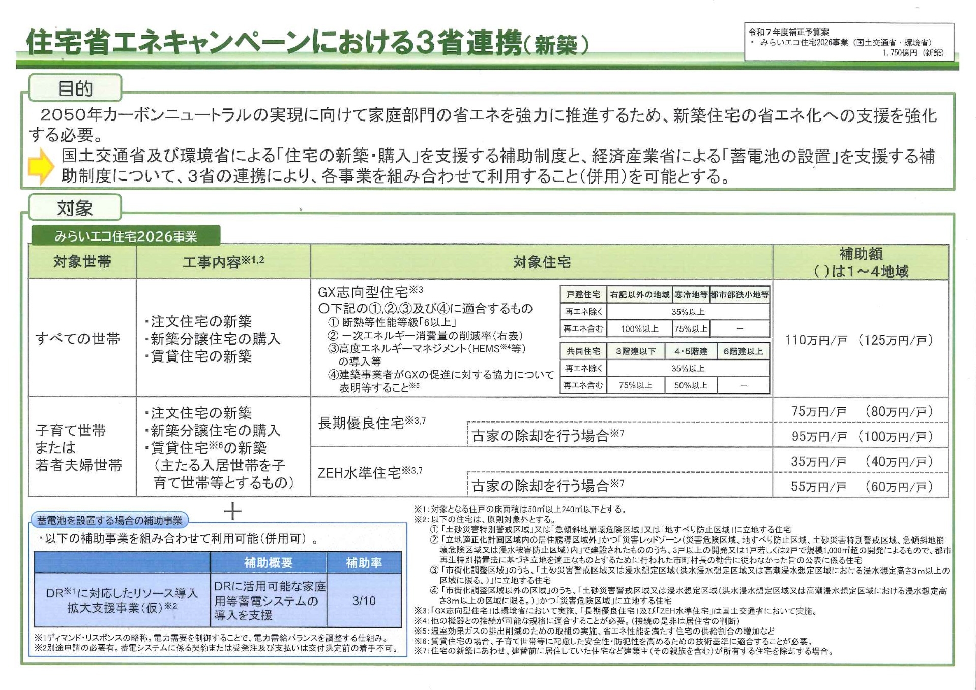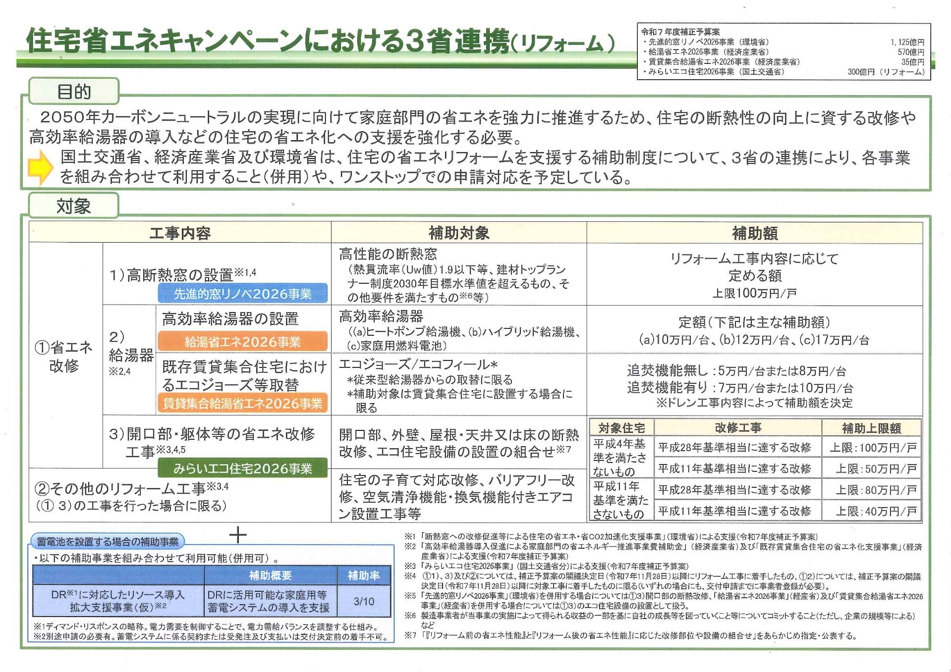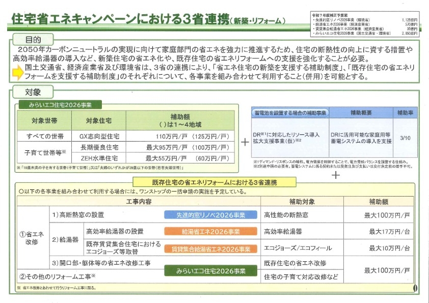 2026年02月04日(水) 住宅省エネキャンペーンのお知らせ 2026年度も引き続き補助金制度の実施が行われるとの発表がありました。 申請開始は3月以降に予定されており、掲載しております情報以外の詳細は順次発表されることと思われます。 今後の更新にて、お知らせ致します。 ※国土交通省・経済産業省・環境省発表資料より引用しております。 ※制度の適用には条件があります。 ※条件・補助金額等は、2025年度事業より変更があります。